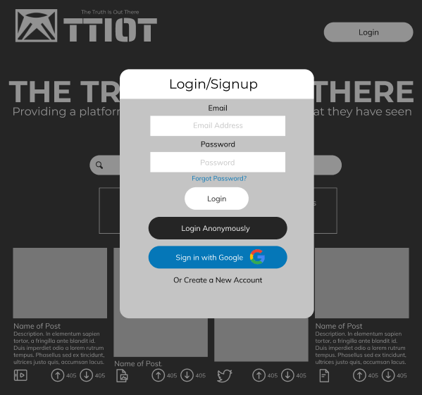 This is a web design that I worked on for a UFO Social Website called TTIOT (The Truth Is Out There). The website itself was going to be a place where people can share images, videos, posts, etc of UFO and High Strangeness. The website would allow a person create an account or post anonymously of all different file formats and from twitter, youtube. The design was to be very simplified and atmospheric with a dark background with white text and icons. The intial landing page would have the logo, login/signup, and just the search bar. After the user has searched the posts would show beneath the search bar. I was trying to create a UFO theme of mysteriousness.